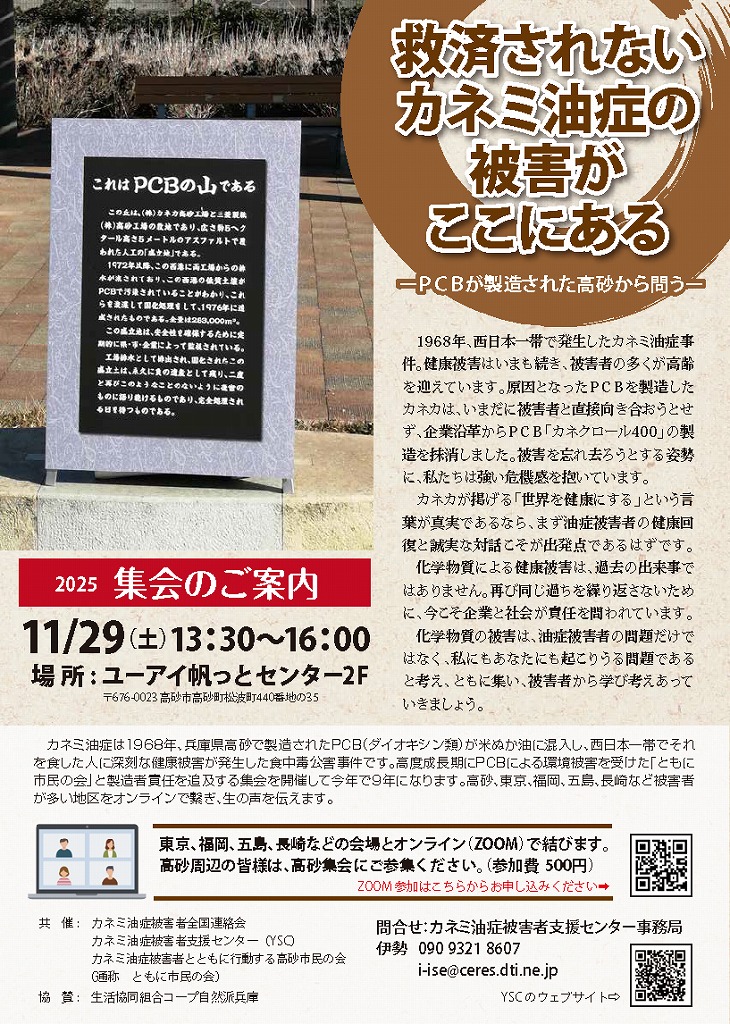 カネミ油症の原因物質PCBが製造された兵庫県高砂市で、PCBの製造企業カネカの社会的責任を問いかけるため、油症被害者、高砂市民、支援者、全国からの参加者が集まり集会を始めてから、9年目となります。